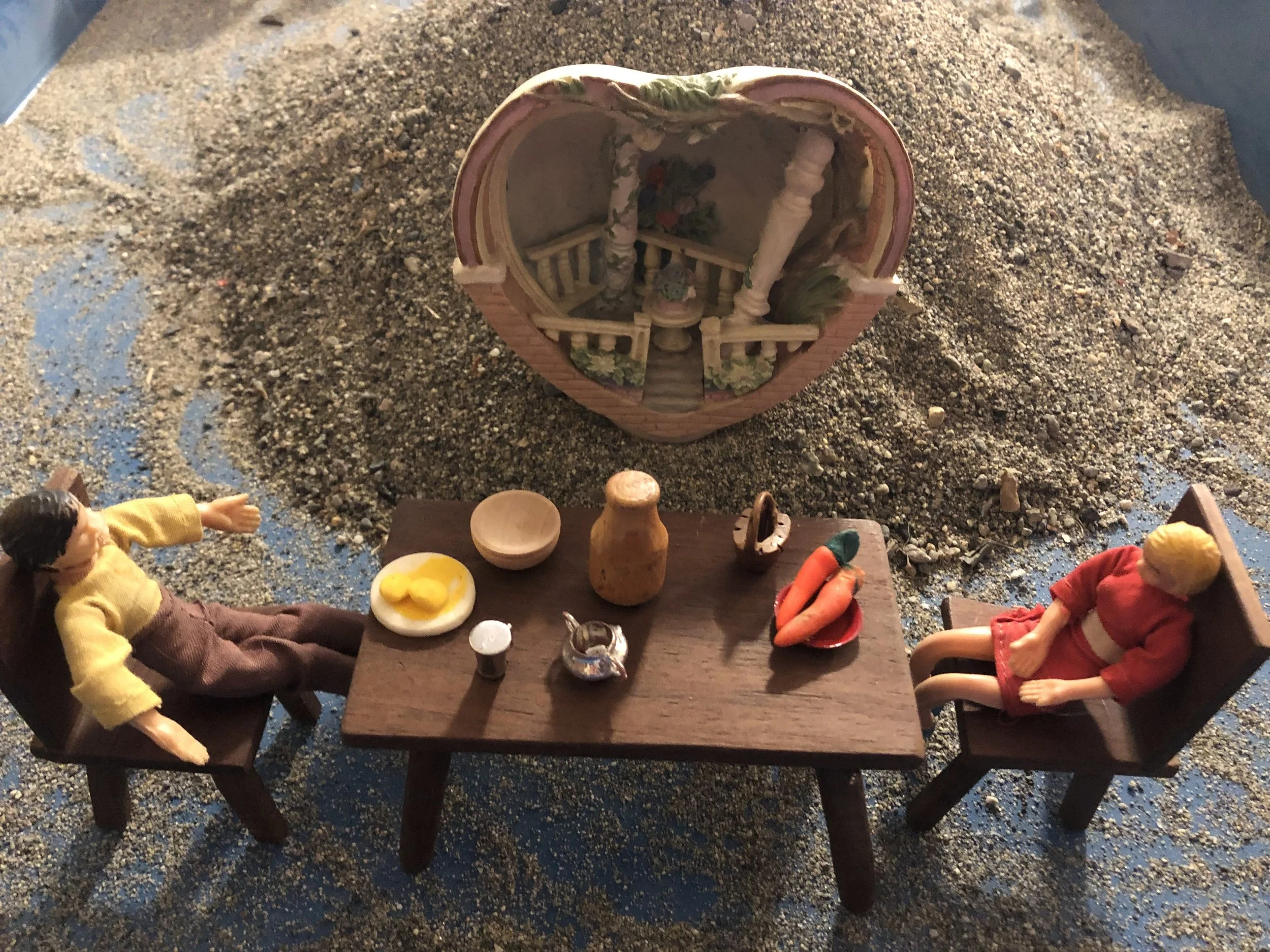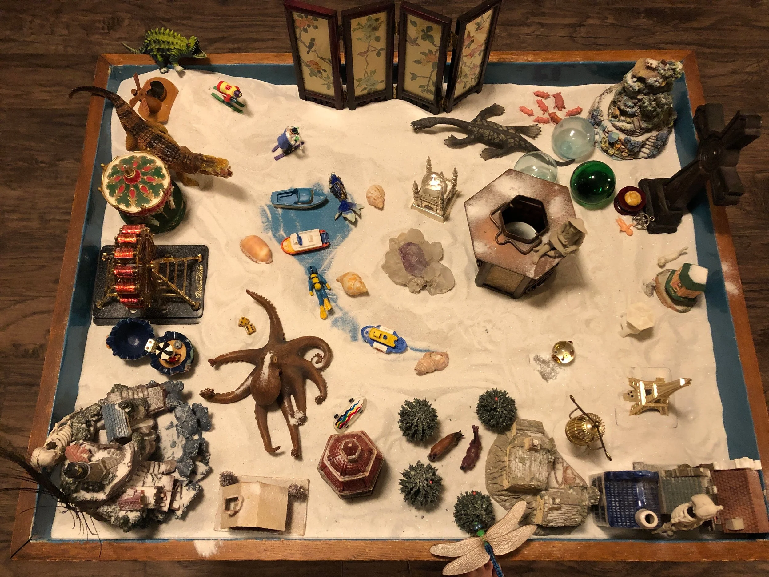 My interest in Sandplay Therapy spans back 40 or more years, to my childhood when my mother was using Sandplay Therapy with her clients (based on the archetypal work of Carl Gustov Jung and pioneering sandplay work of Dora Kalff in Switzerland). In the 1980s I was fascinated with the approach, read books by Dora Kalff, used my mom’s sand tray, and as a teen, started thrifting to add to my mother’s Sandplay figurine collection. Some pieces in my current figurine collection date back to this time.